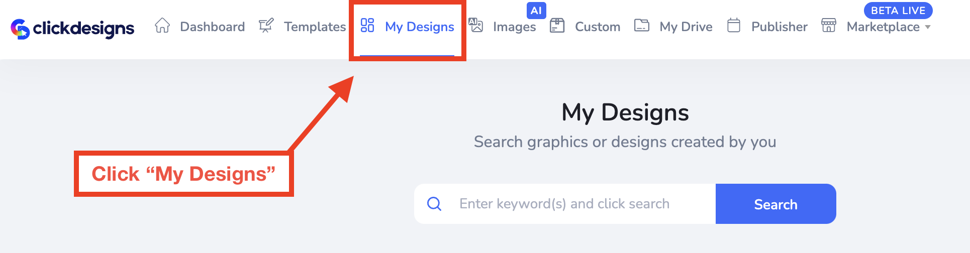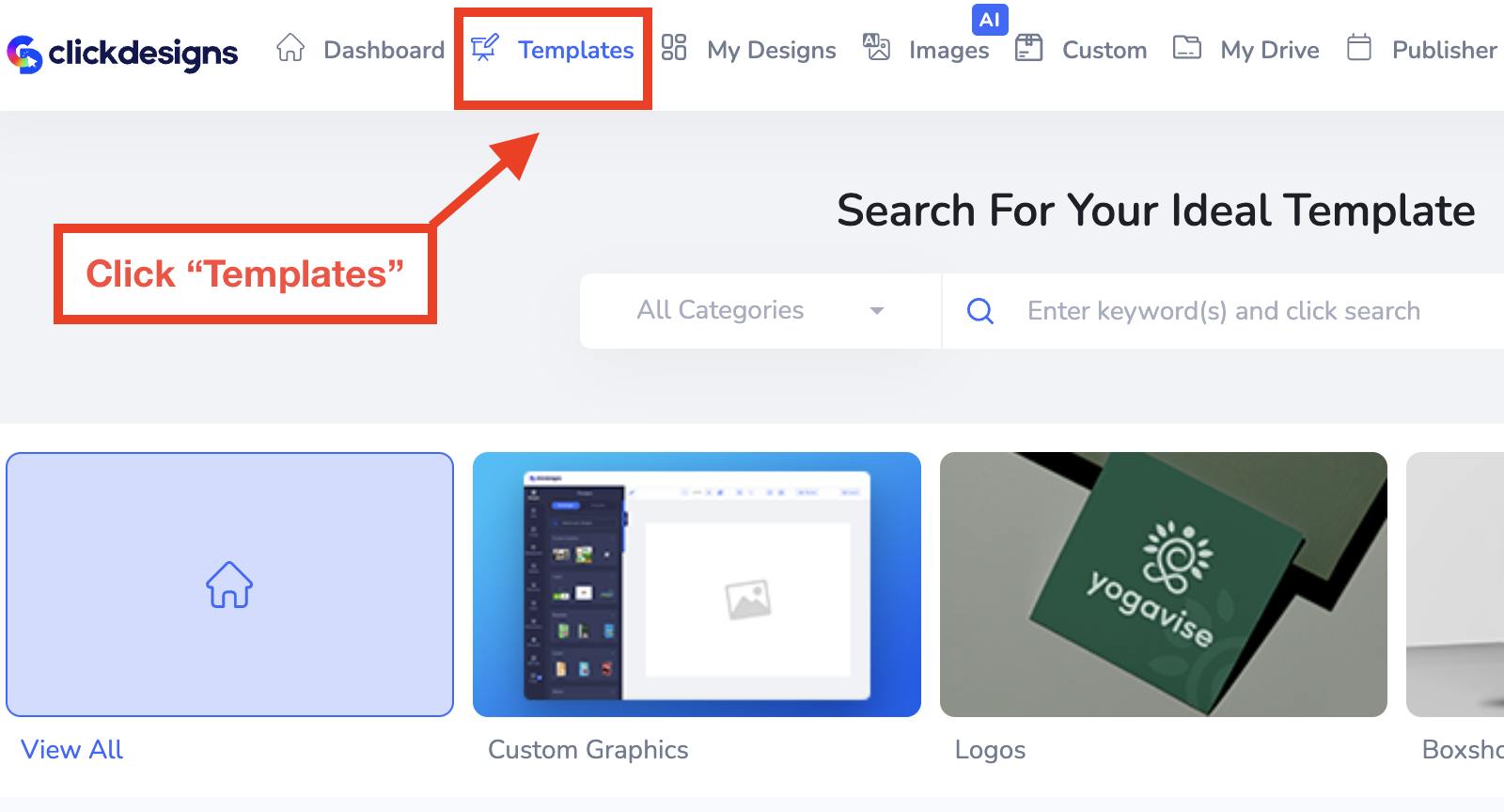 Once you're logged into your ClickDesigns and loaded up your dashboard, click on "Templates" to go to the Template section of ClickDesigns.