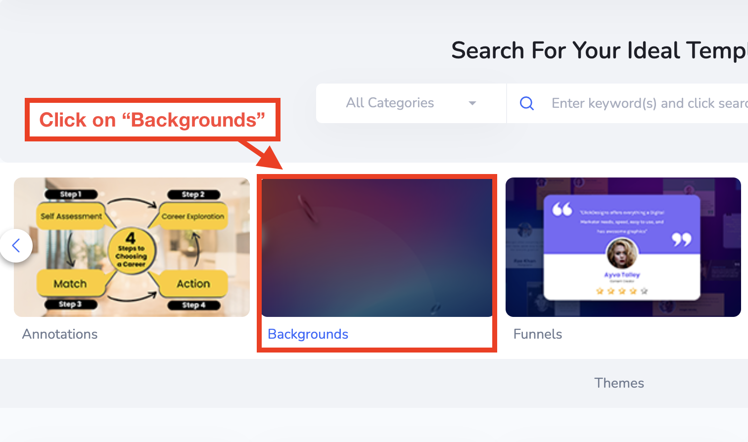 Once you've clicked on "Backgrounds," ClickDesigns is going to give you different types of elements that allow you to get individual blocks or Themes. From here, click on "Themes."
