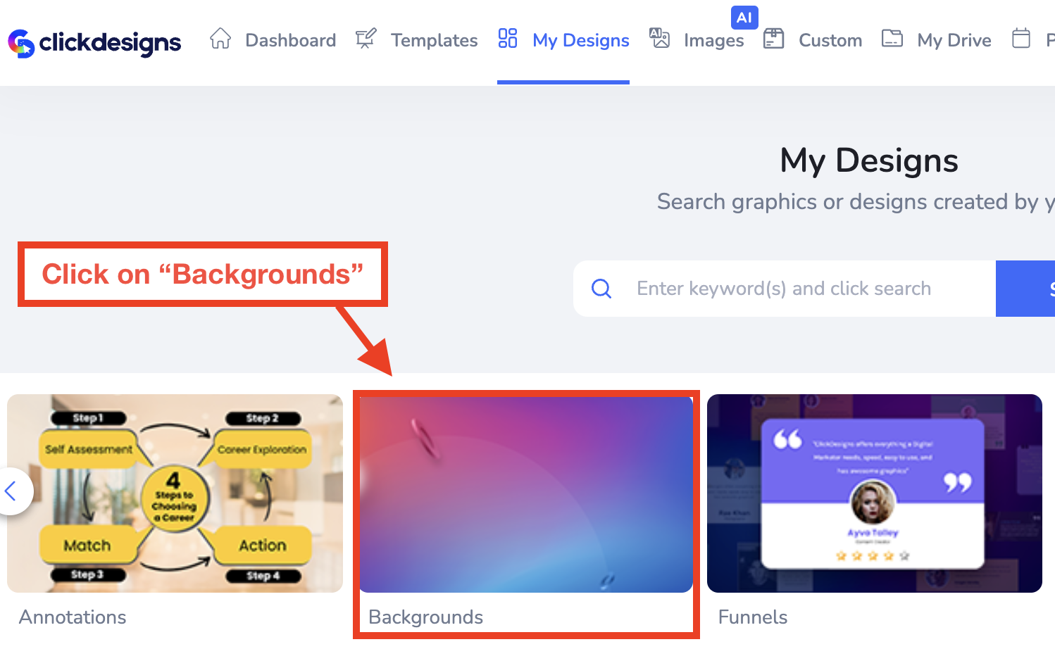 Scroll through the different features and design template categories until you come across "Backgrounds." Click on this category.