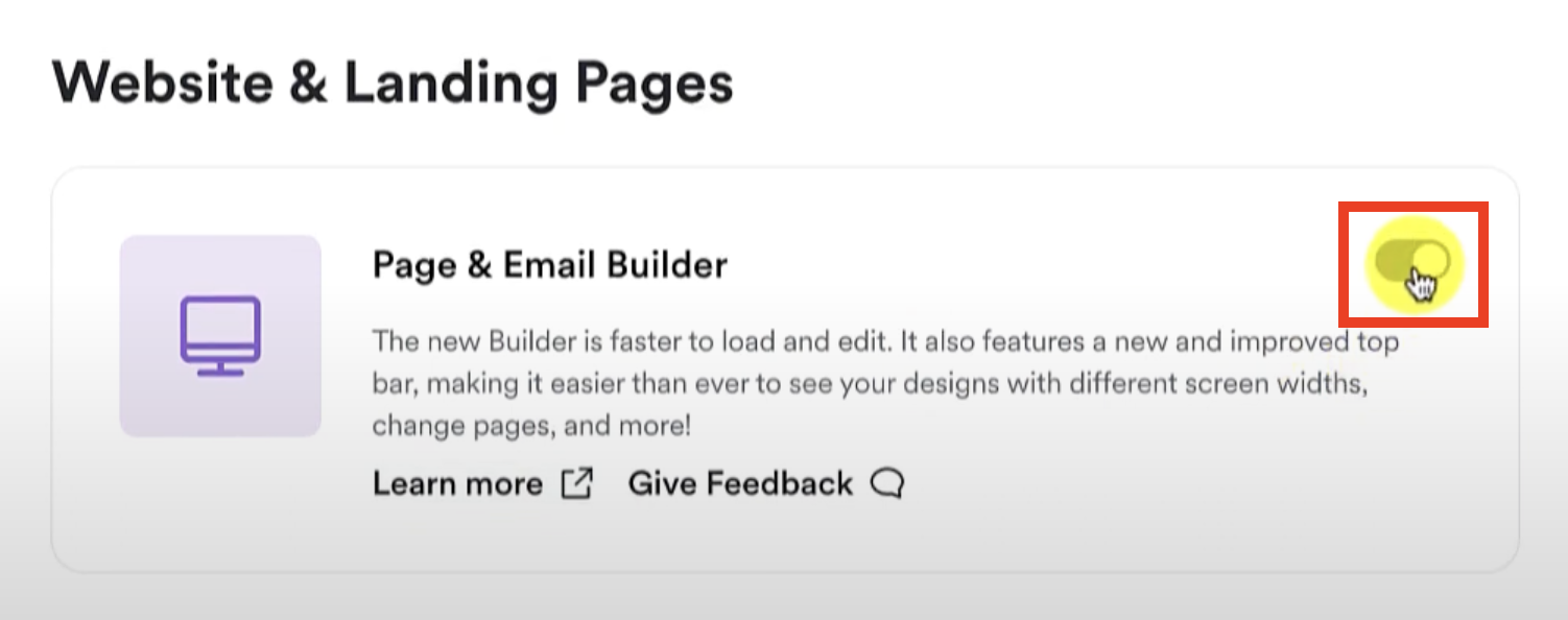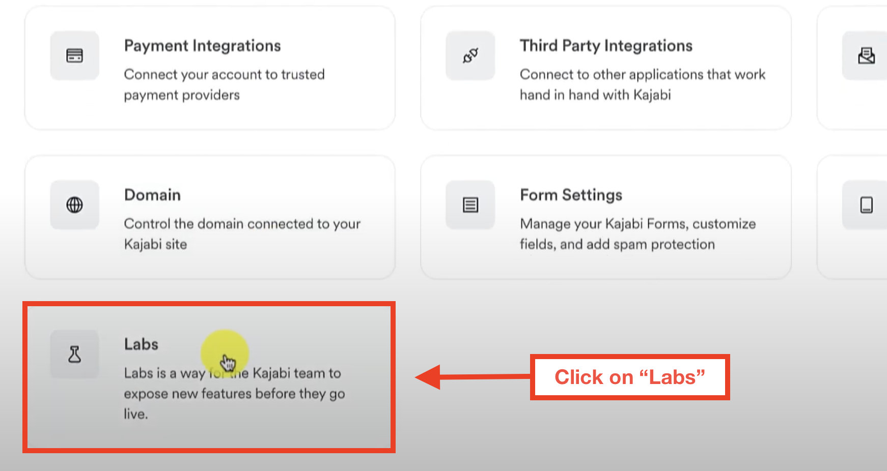 First, make sure you already have an active Kajabi account, whether it's a free trial or a paid version. Here, we have to make sure that the editor for the website is turned on. Click on "Settings," scroll down to "Labs," and make sure that the "Page & Email Builder" section is enabled.