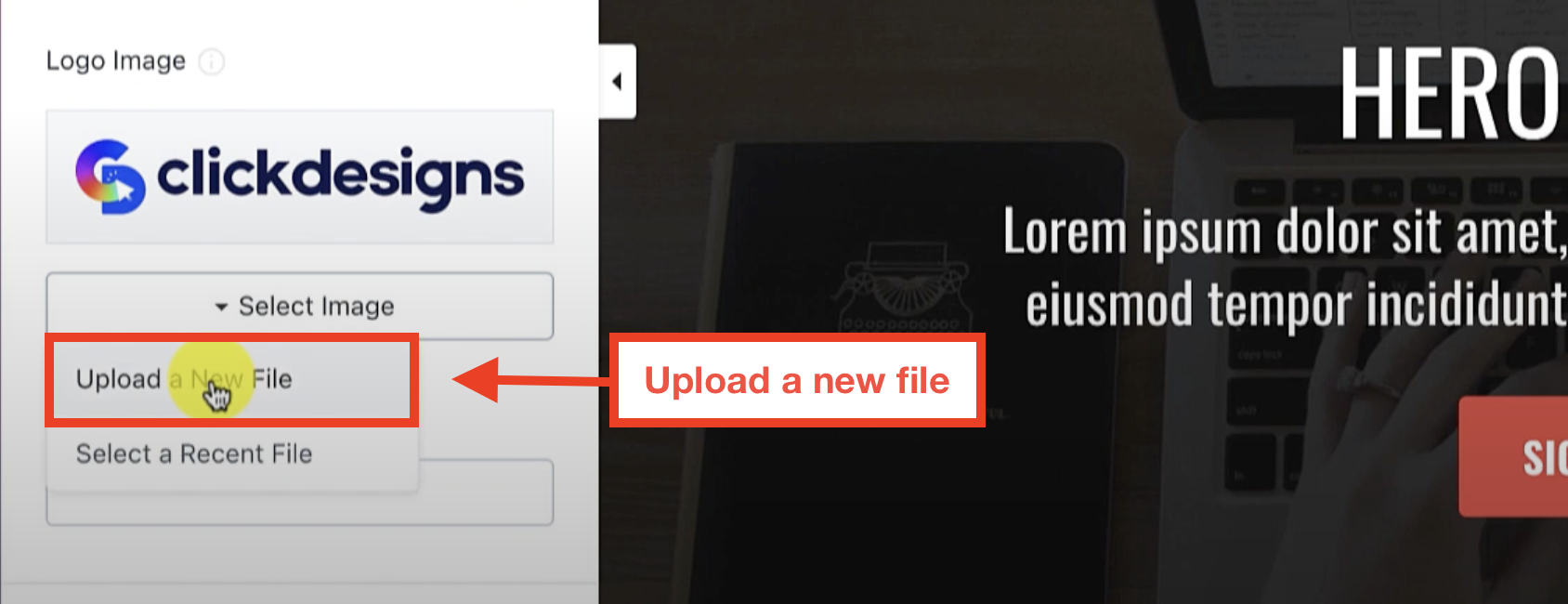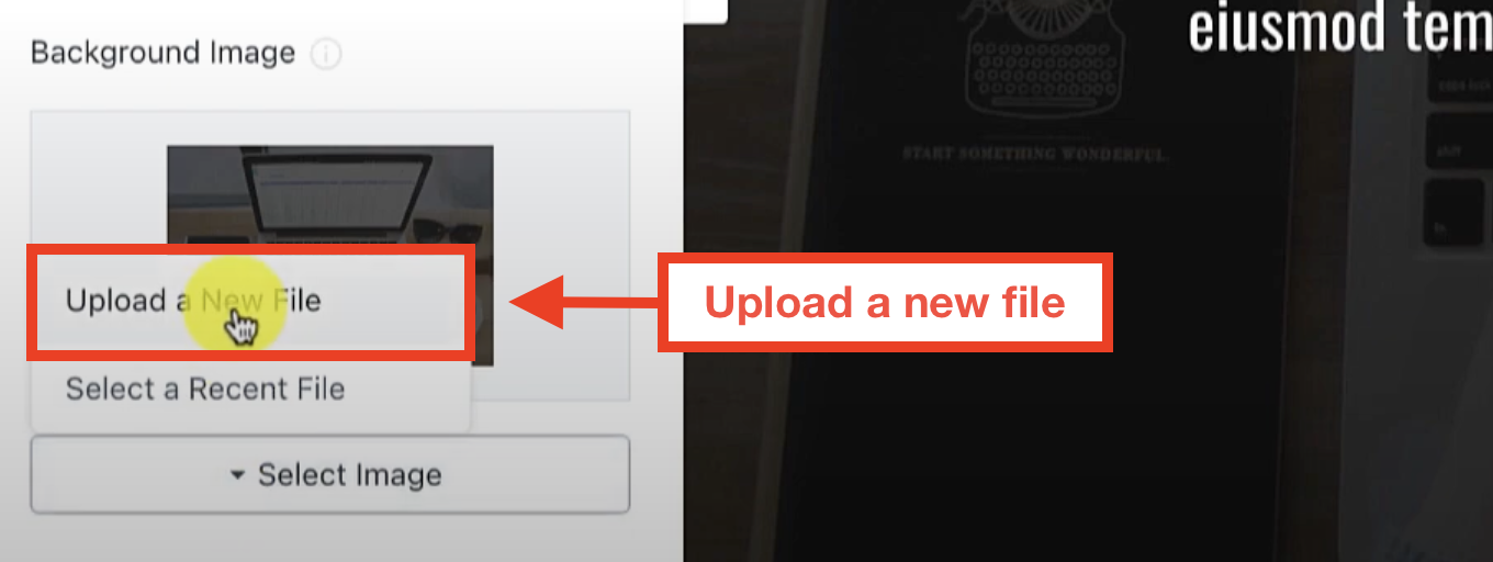 You can also change the background image of your page by uploading a new one from any design you've created and saved from your ClickDesigns account. Simply select the background image, scroll down, and choose "Upload A New File."