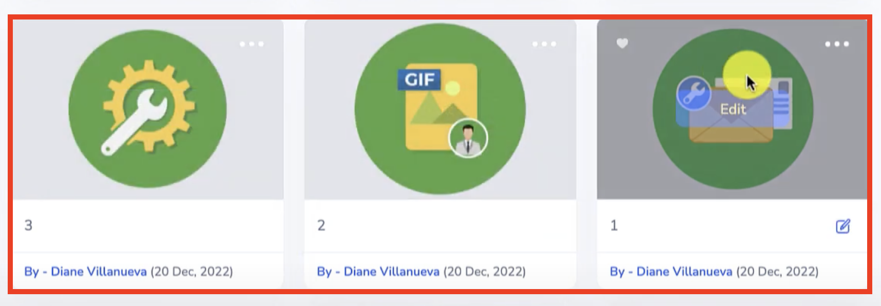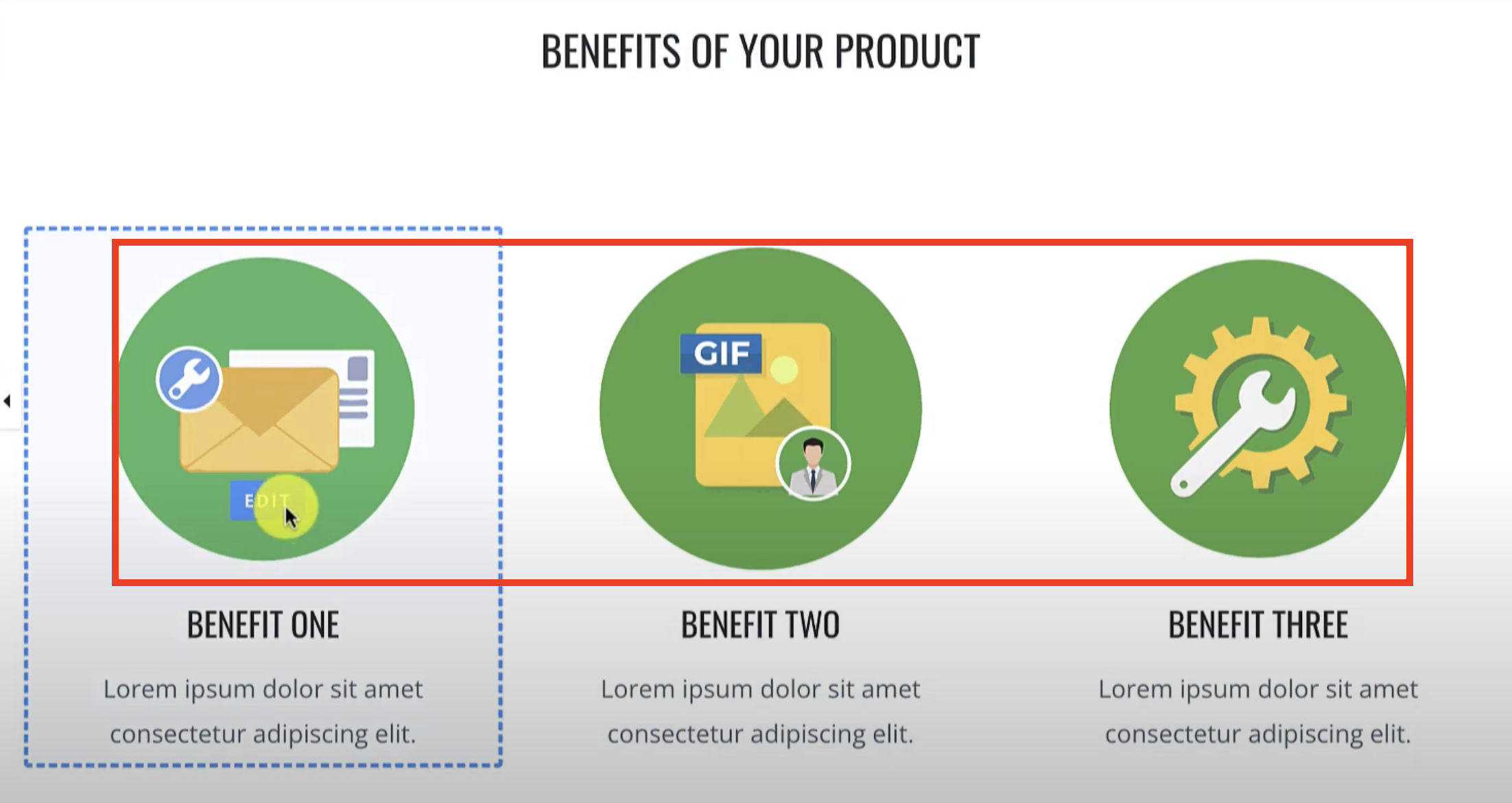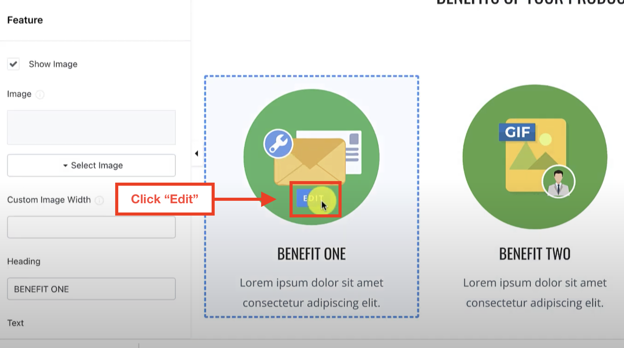 Once your new icons from ClickDesigns are saved, go back to your Kajabi account, hover over the placeholder images for the icons, and then click on "Edit." Here, scroll down and choose "Upload A New File."