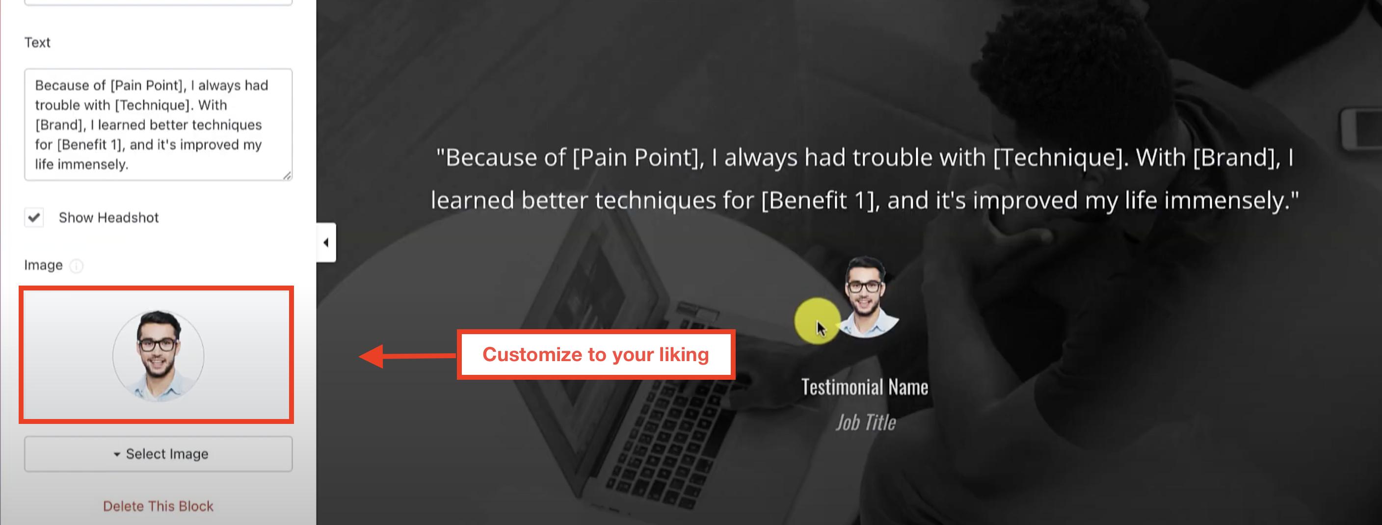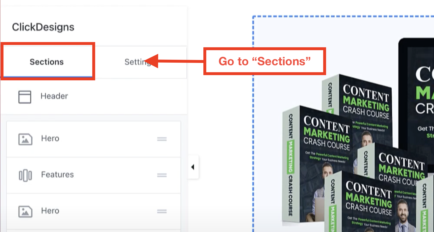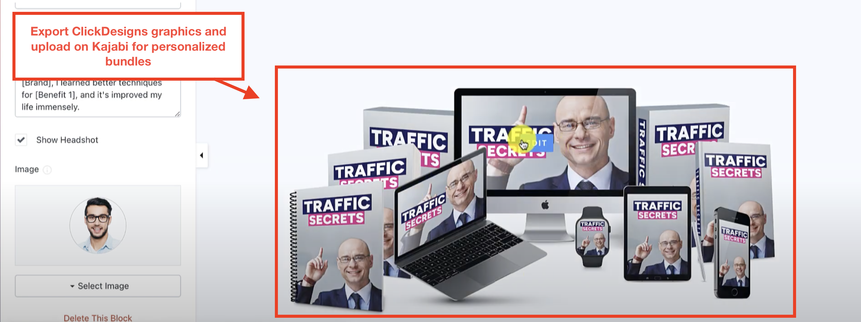 Simply repeat the process and customize your page on your Kajabi website using your ClickDesigns designs to your liking. You can customize its feature icons, testimonials, bundles and groupshots, and so much more!