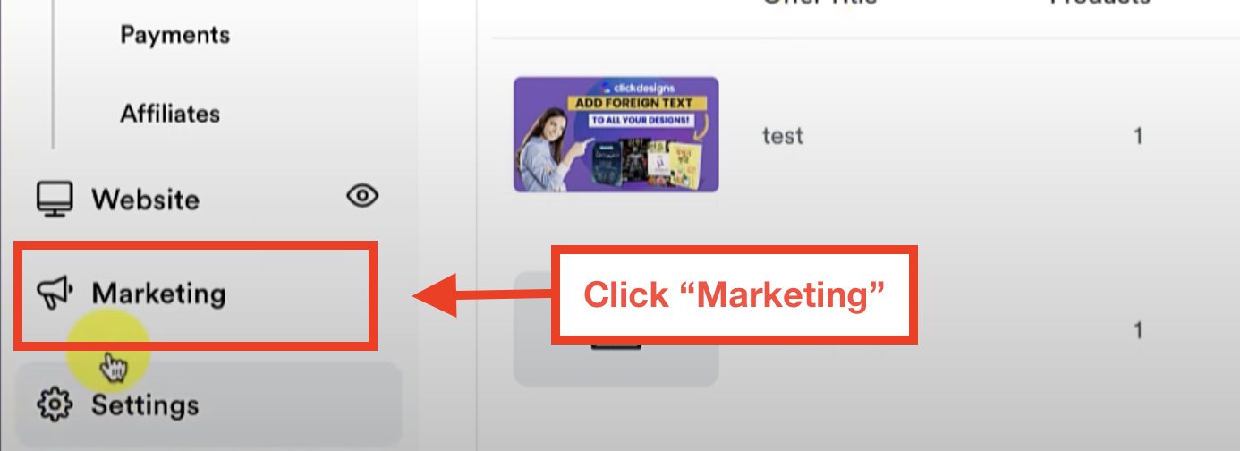 You can also use ClickDesigns for your email marketing campaigns on Kajabi. Here, click on "Marketing."