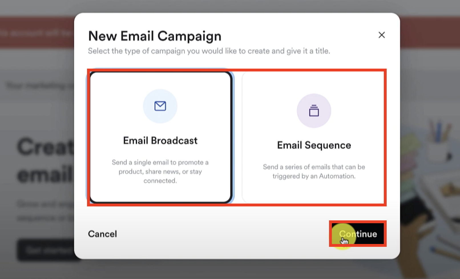 Select what email campaign you'd want to create, and then, click on "Continue."