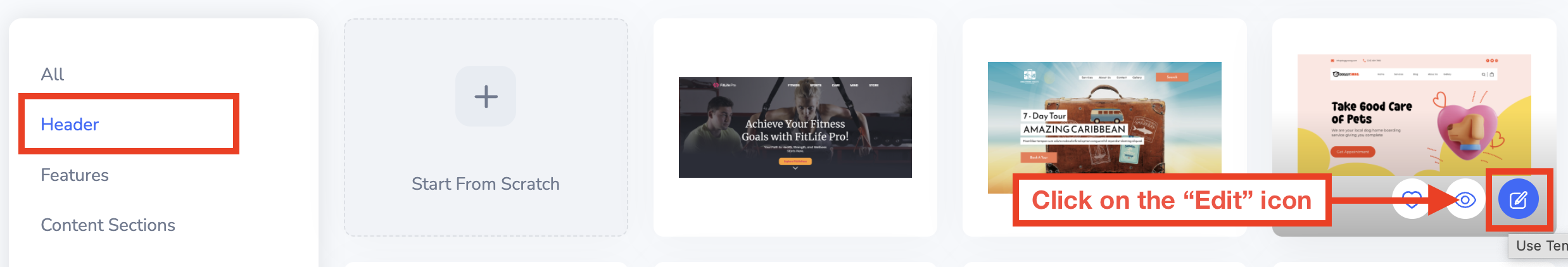 Choose a template category, and once you find a template you'd like to use, click on the "Edit" icon by hovering over it.