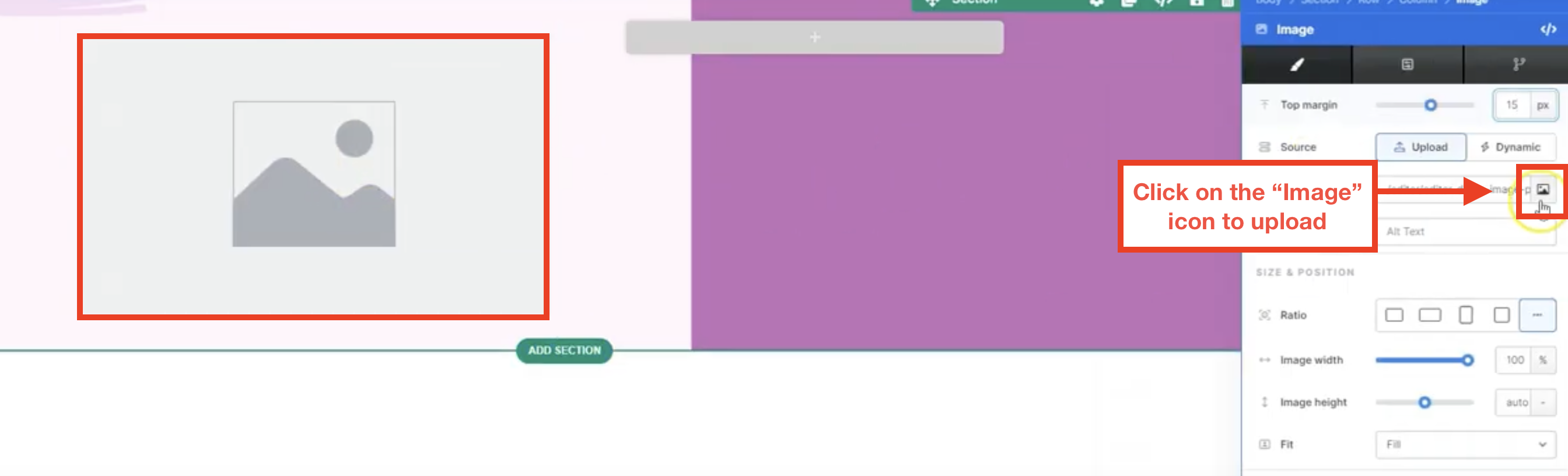 Let's try uploading an image for our Header Section Background. Once this is done, you can add another image element by clicking on the image icon and uploading your design.