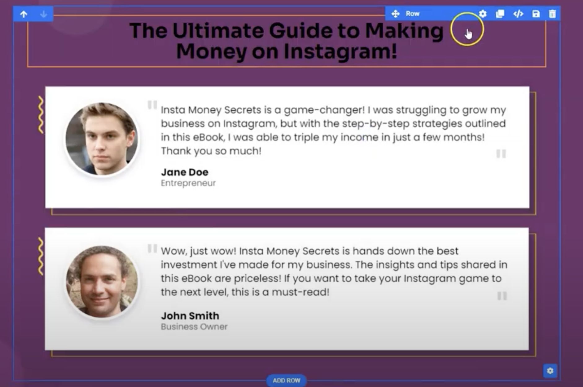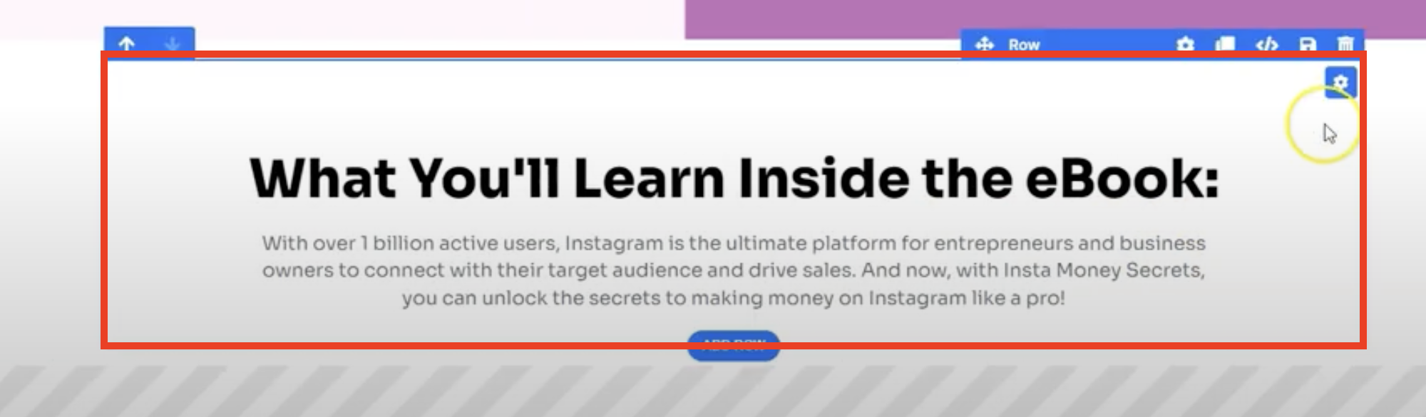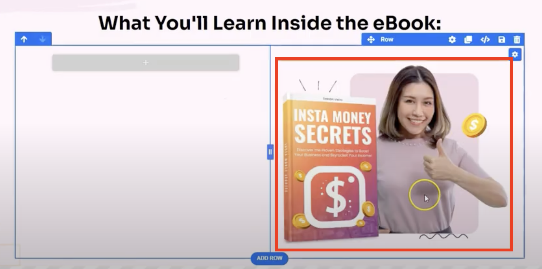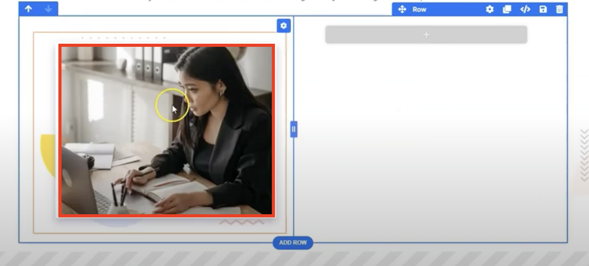 Once satisfied with the adjustments, let's add an additional section with two columns by clicking on "Add Row." The first column is going to be an image, so choose "Image" and "Image Upload."