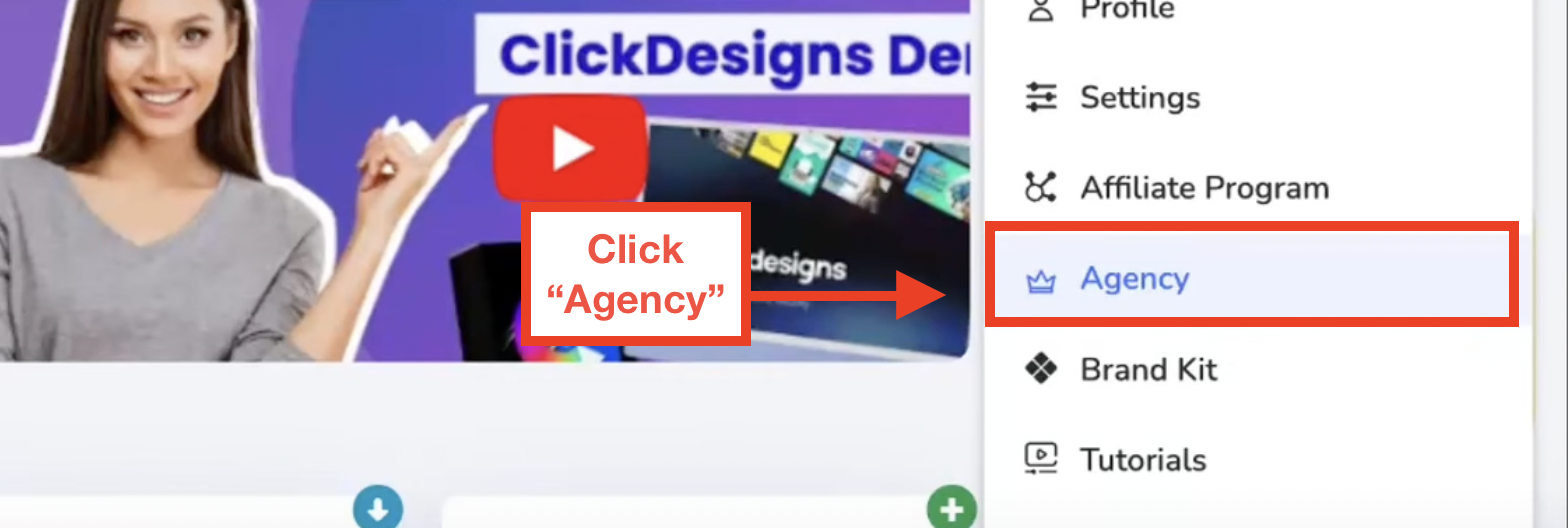 You can now finally edit the access levels of the team members you add onto your Agency Brand Kit(s). Please note that this feature is only available for users with the OTO4 Agency Access. Once you've logged into your ClickDesigns and are on your dashboard, go over to the dropdown menu of your profile and choose "Agency."