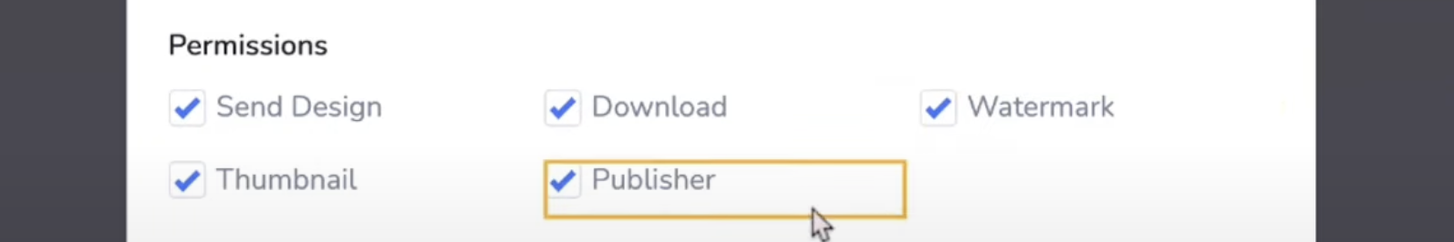 After adding in the information of your team member here, you can edit the Permissions before you add them. You can allow them to send designs, add thumbnails, watermarks, and publishers, as well as download designs.