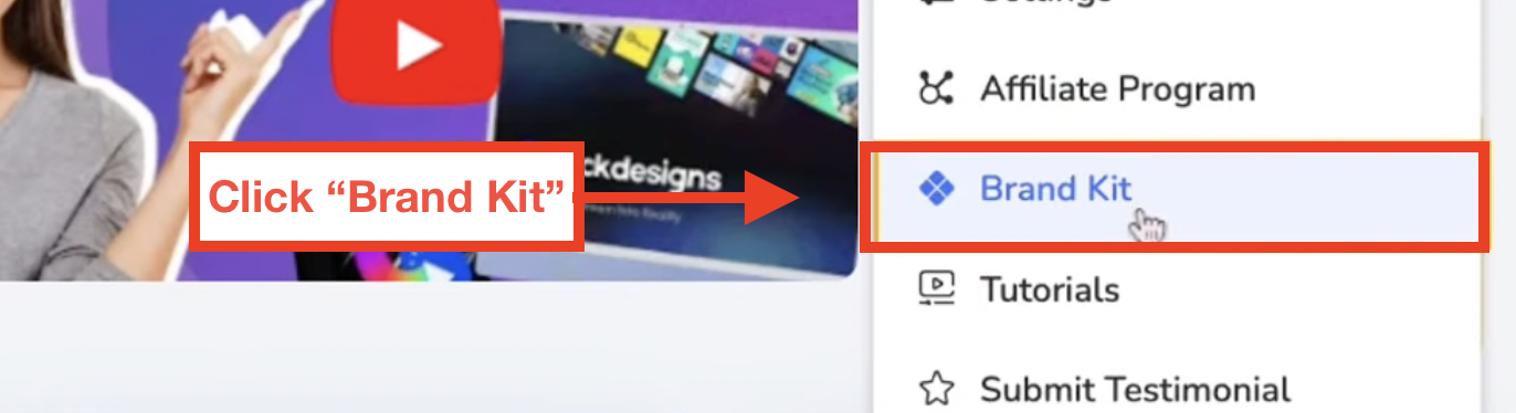 Now, let's look at the perspective of the newly added team member, and see what those enabled permissions look like. As a team member, after you've logged in and are on your ClickDesigns dashboard, go over to the dropdown menu of your profile and choose "Brand Kit."