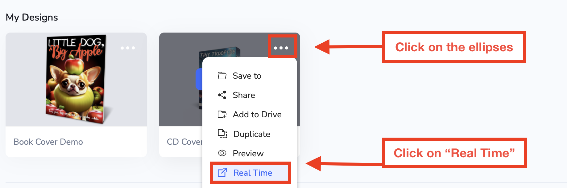 Choosing a design, click on the 3 ellipses on an image that you want to share. From there, click on "Real Time."